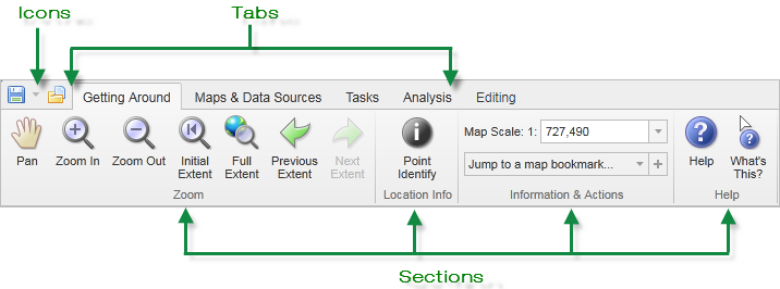 To the left of the tabs are two icons that are always visible and that allow you to save and open projects - maps that you have annotated and saved.