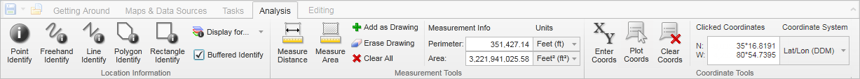 The Analysis tab of the toolbar contains tools to help you find information as well as measure, manipulate, and analyze data.