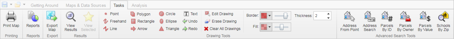 The Tasks tab of the toolbar contains tools for a variety of tasks including printing, running reports, exporting, viewing the results of searches, annotating the map and specialized searches.